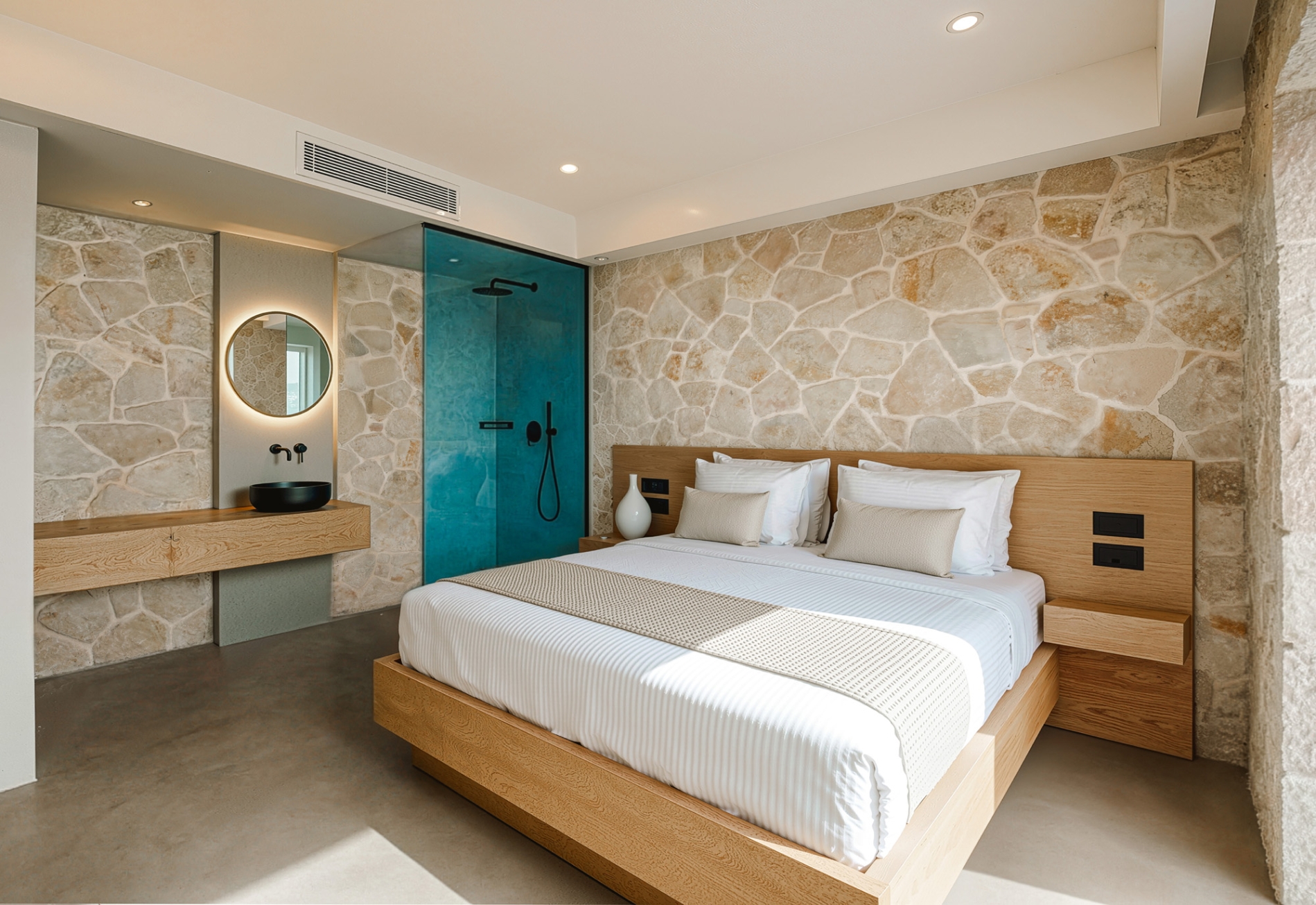 The Deluxe Double Room combines comfort and functionality for a pleasant stay. Decorated in warm tones with modern furnishings, it features a comfortable double bed, air conditioning, TV, mini fridge, and complimentary Wi-Fi.