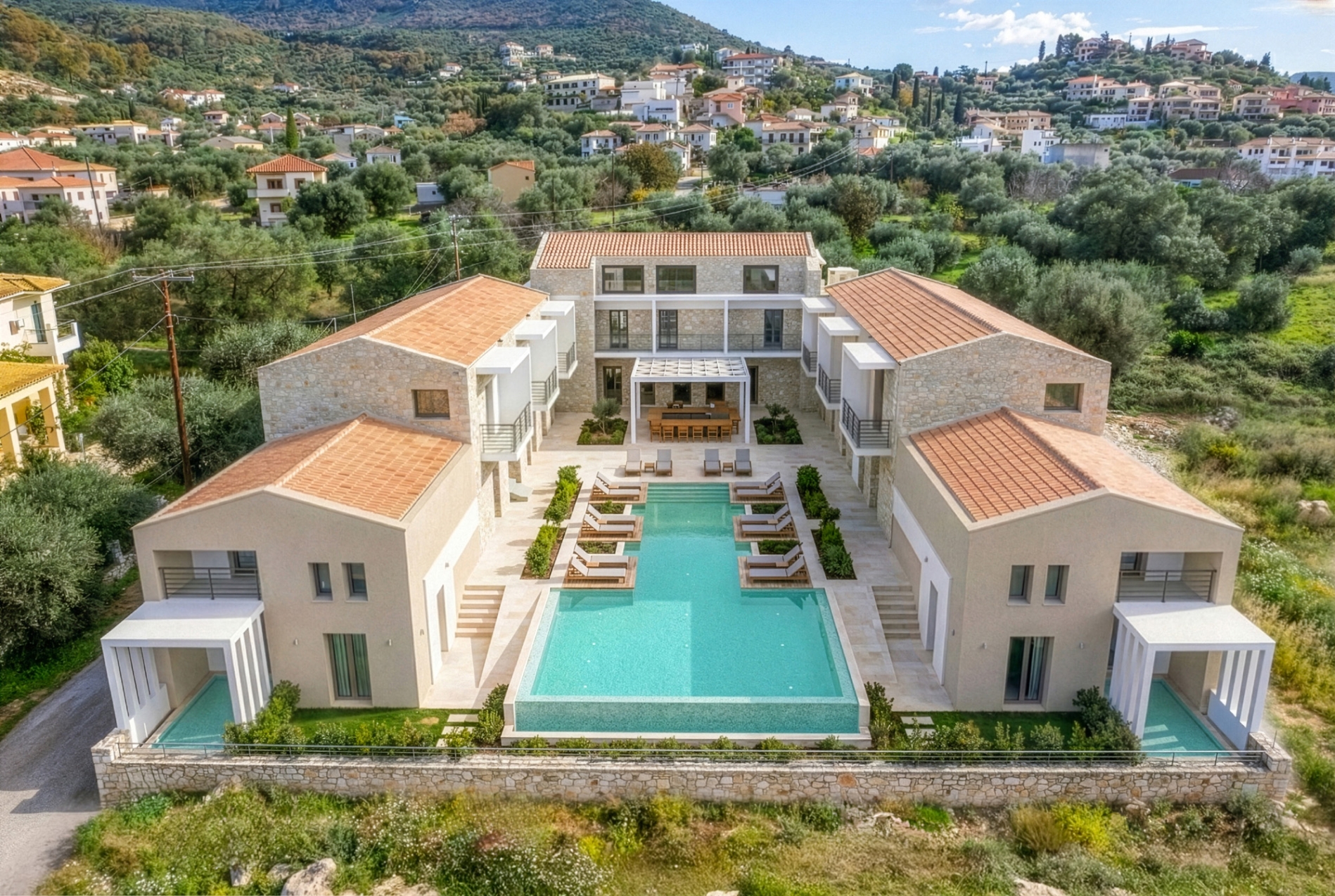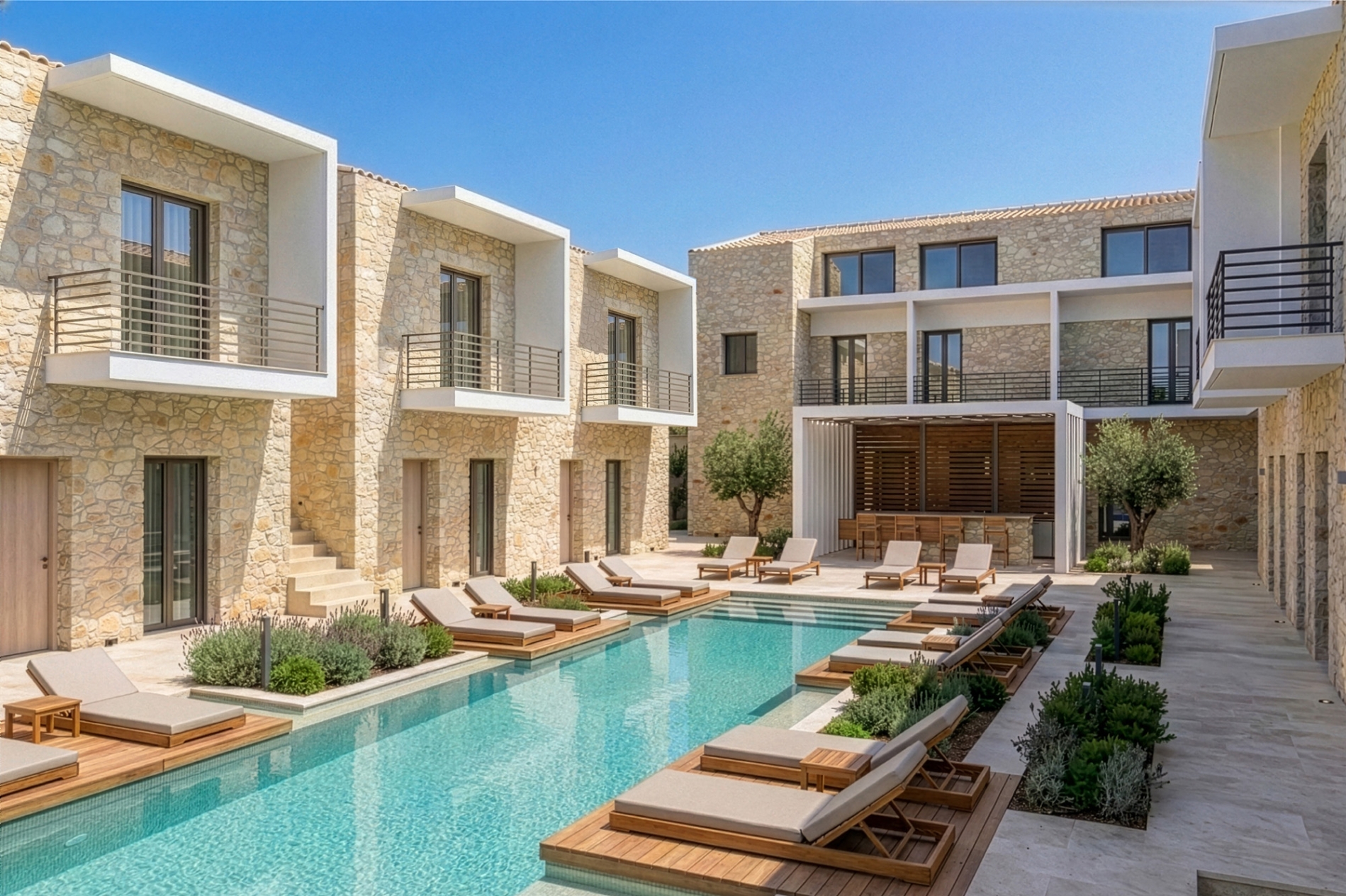 The hotel’s architecture is based on natural stone and high-quality earthy materials, creating a timeless blend of traditional aesthetics and contemporary minimal design.